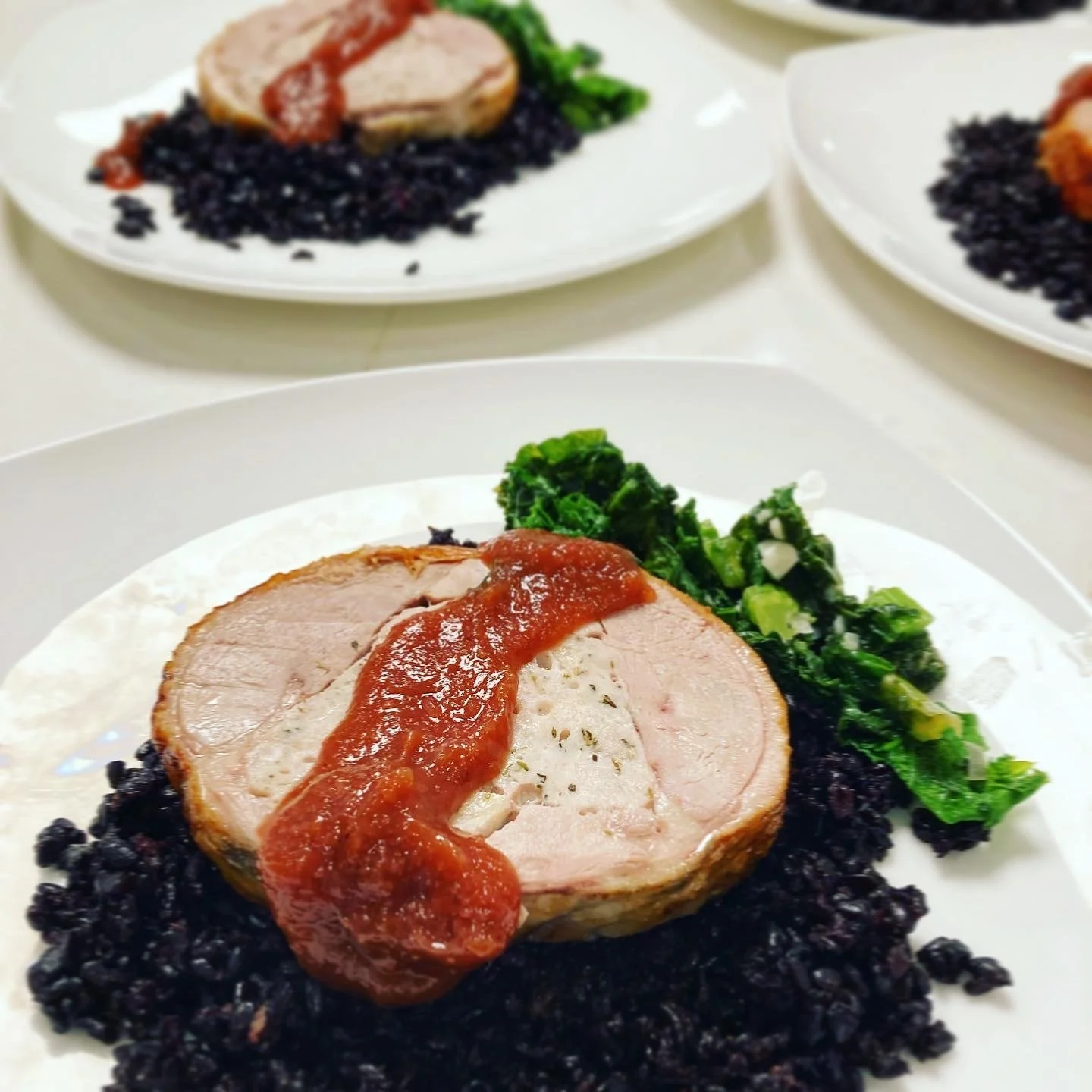 Duck, herbes de Provence chicken sausage, salted plum sauce, black rice pilaf, fermented mushroom paste, greens