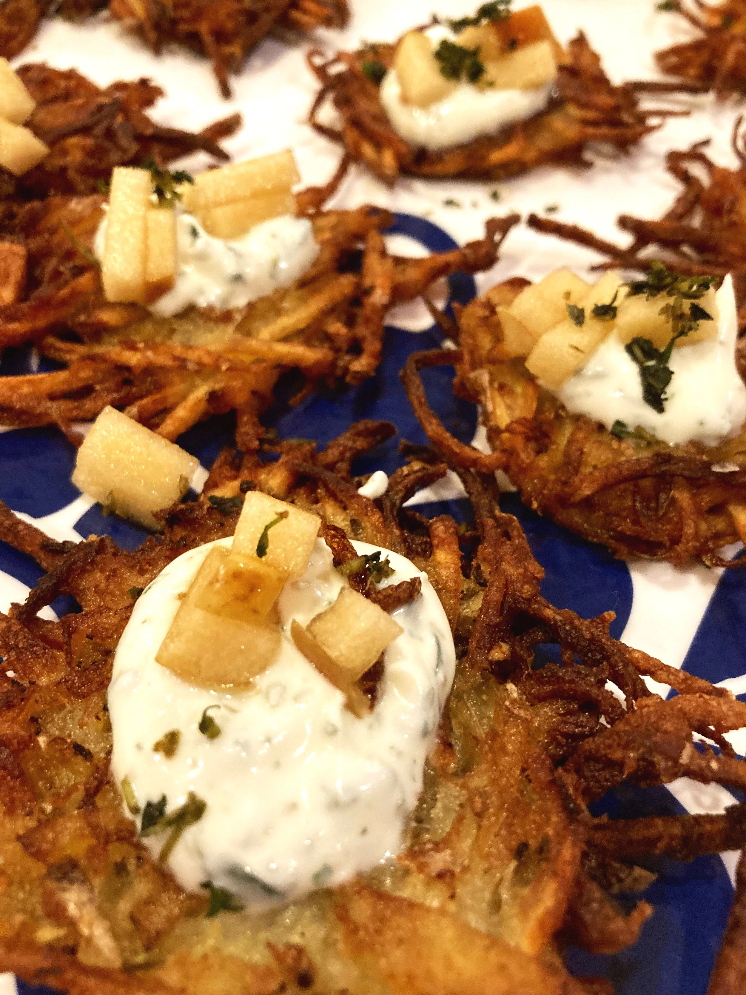 Mini potato cake, herb creme fraiche, pickled apples, thyme